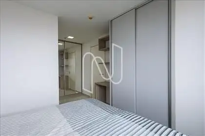 Quarto com armários planejados, espaço para home office e excelente aproveitamento interno.