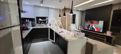 Cozinha americana com armários planejados, bancada de granito, cooktop e exaustor.