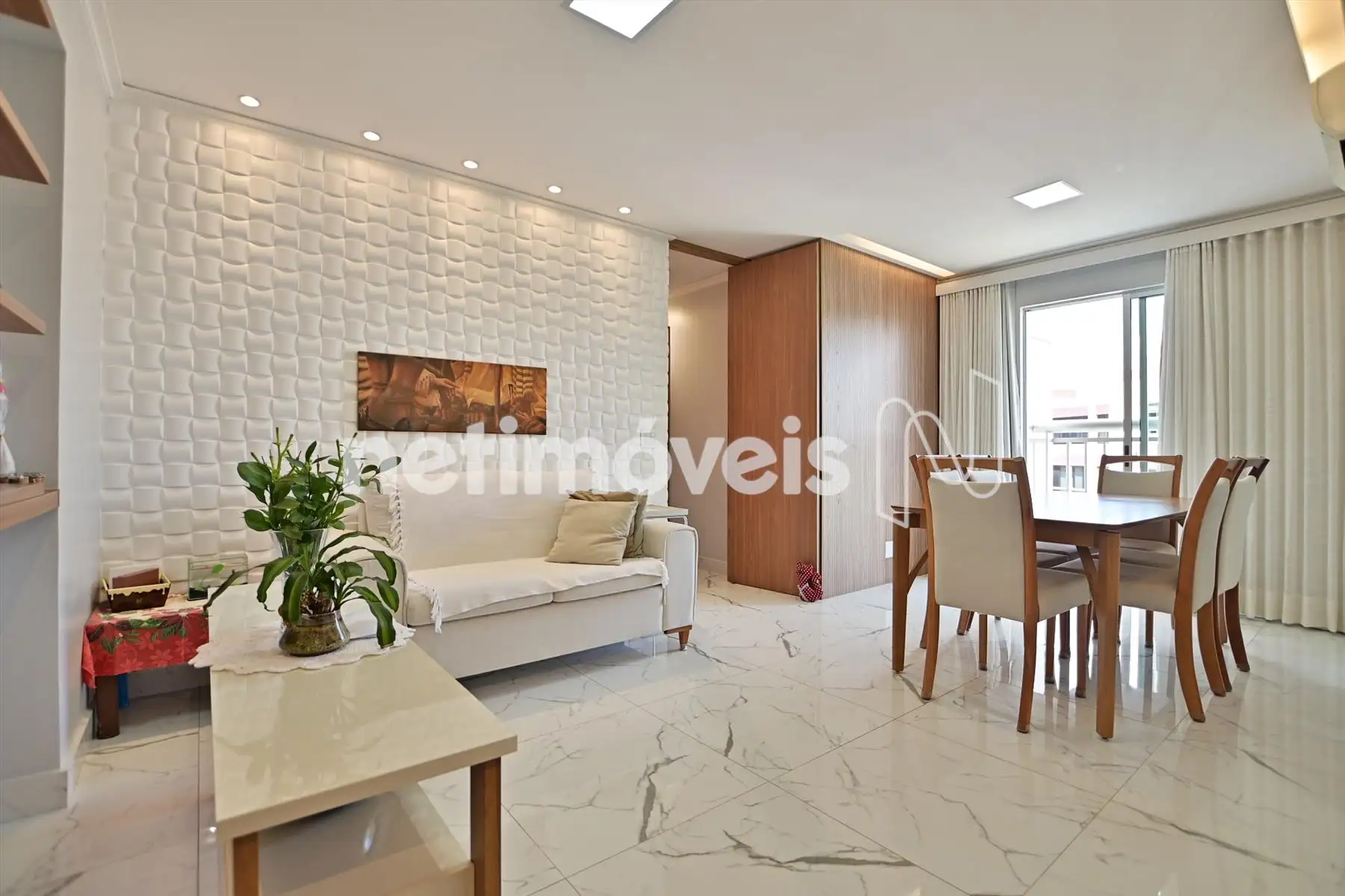 Sala com varanda incorporada, com piso em porcelanato.