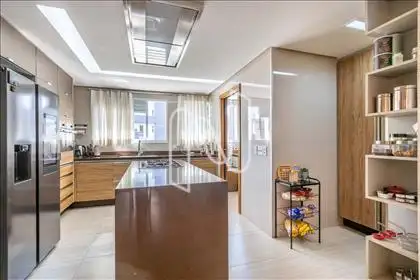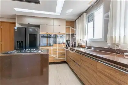 Cozinha ampla com ilha central, equipada com torre quente, coifa embutida no teto e eletrodomésticos de última geração, aliando requinte e praticidade;